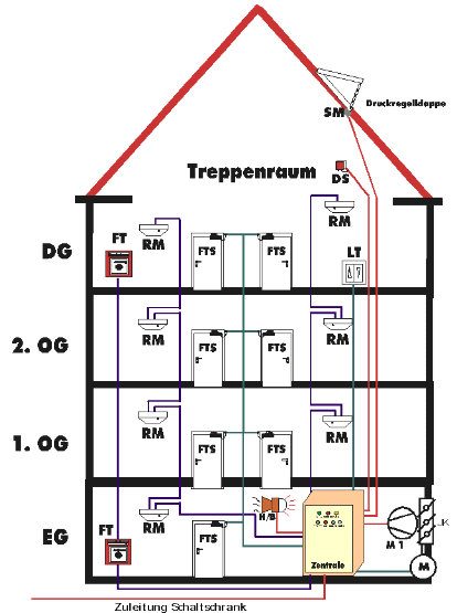 Rauchschutz Druckanlage (RDA) Flucht- und Rettungswege müssen im Brandfall eine sofortige Evakuierung der Bewohner und einen schnellen Zugang der Rettungskräfte ermöglichen. Druckbelüftungsanlagen sind in diesem Fall entwickelt worden, da sie im Brandfall durch ihre Meldetechnik (Rauchmelder RM) aktiviert werden. Der Überdruckventilator (M1) bläst Frischluft in den Treppenraum, dadurch wird der Rauch ins freie gedrückt und durch den entstehenden Überdruck (max. 50 Pa) das erneute Eindringen von Rauch massiv verhindert. eine solche Anlage arbeitet automatisch, kann aber auch per Hand (Handtaster FT) ausgelöst werden. Alarmsirene und Blitzleuchte (H/B) alarmieren die Bewohner, der Stellmotor (SM) steuert die Druckregelklappe über das vom Drucksensor (DS) aufgenommene Drucksignal und hält den Überdruck konstant. Die Jalousieklappe (JK) sperrt im Normalbetrieb den Lüftungskanal, wird aber im Alarmfall schlagartig geöffnet und ermöglicht das Ansaugen von Frischluft aus dem Freien. Eventuell vorhandene Freilufttürschließer (FTS) schließen die Wohnungstüren mittels Federkraft gegen den Überdruck im Treppenraum und verhindern ein unkontrolliertes Abströmen. Im Normalbetrieb ist die Federkraft aufgehoben, erst im Alarmfall wird sie aktiviert. |
